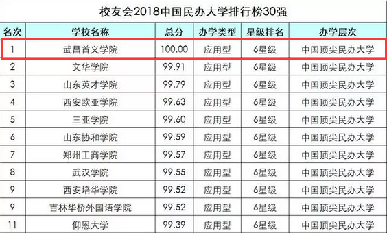 新年将至,喜讯传来。12月25日,艾瑞深中国校友会网编写完成的《2018中国大学评价研究报告——中国高考志愿填报指南(校友会版)》最新发布2018中国大学排行榜、中国最好大学排行榜、中国非双一流大学排行榜、中国民办大学排行榜、中国独立学院排行榜等榜单。报告显示,按照艾瑞深中国校友会网2018中国大学最新分类标准,民办大学被归类为“中国应用型大学”,在最新2018中国民办大学综合实力排行榜中,武昌首义学院综合实力最强,以满分100分问鼎2018中国民办大学排行榜首,荣膺2018中国六星级民办大学,跻身中国顶尖民办大学行列。