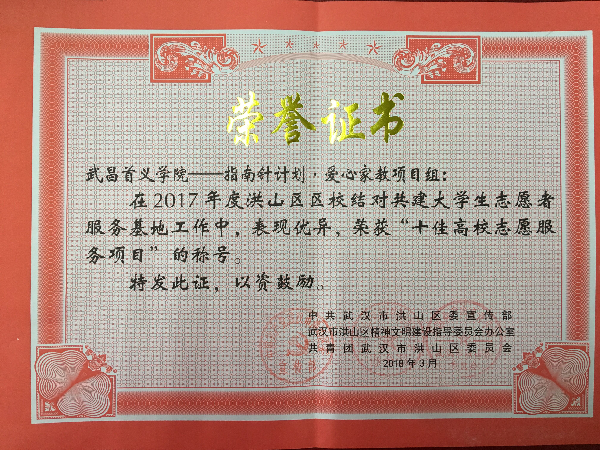 3月5日下午,洪山区举行“志愿青春·爱我洪山”“3·5”学雷锋志愿服务系列活动启动仪式暨2017年度区校结对“五个十佳”颁奖仪式,对2017年洪山区区校结对共建志愿者服务基地工作中涌现出来的优秀组织单位、项目、团队、个人及社区等进行了表彰。我校“指南针计划·爱心家教项目”荣获“十佳高校志愿者服务项目”。这是我校第二次荣获该誉。