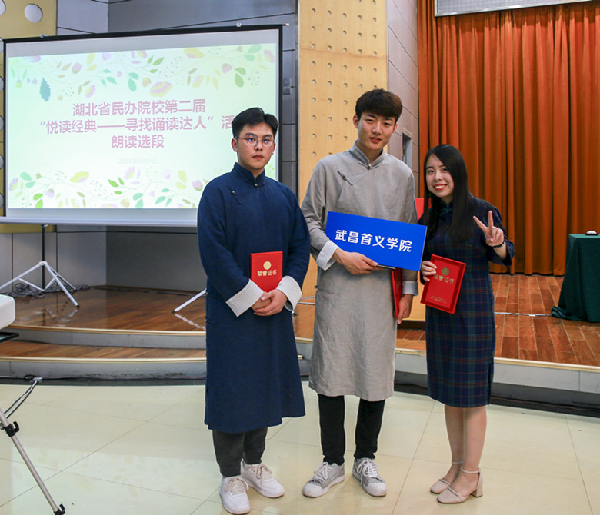 5月9日,湖北省民办院校第二届“悦读经典—寻找诵读达人”朗诵大赛总决赛在武汉东湖学院举行,武昌首义学院、武昌工学院、武汉东湖学院、汉口学院、武汉工商学院等14支代表队竞技总决赛,我校代表队以总分第二的成绩荣获二等奖,校图书馆获“优秀组织奖”。