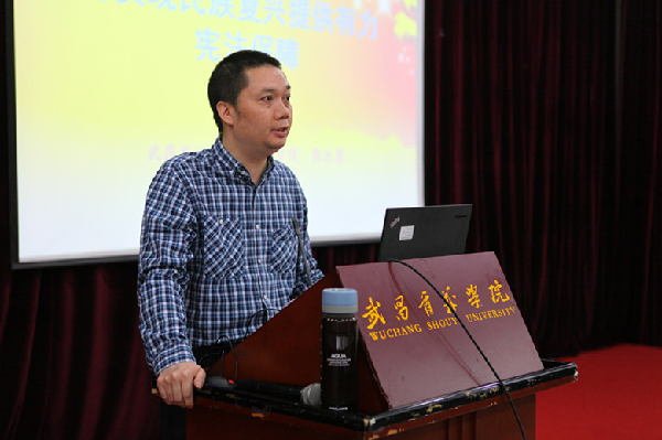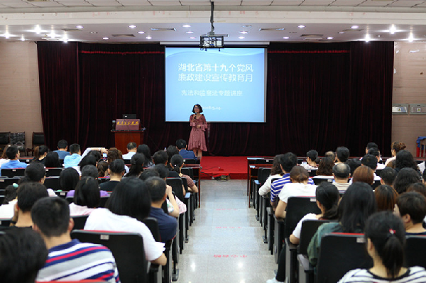 根据学校“贯彻落实湖北省第十九个党风廉政建设宣传教育月活动”方案,5月24日下午,校党委举办《中华人民共和国宪法》《中华人民共和国监察法》专题报告会,新闻与法学学院文法系主任陈永蓉博士、副主任戚莹博士担任主讲。校领导金国杰、邹星庐,党委委员,全校教工党员、科级以上干部共同聆听。宣传部副部长王艳青主持。