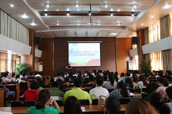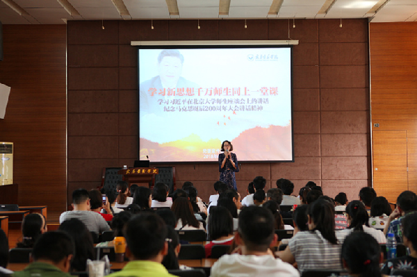为深入学习习近平总书记视察湖北重要讲话精神、习近平总书记在北京大学师生座谈会和纪念马克思诞辰200周年大会上的重要讲话精神,进一步深入学习贯彻习近平新时代中国特色社会主义思想,推进新时代高校思想政治工作改革创新,6月14日下午,学校举行“学习新思想千万师生同上一堂课”活动,湖北省师德先进个人、外国语学院党总支副书记杨芳为师生授课。党委委员、学工部部长李雪,党委委员、校团委书记罗萍,各院党总支副书记出席活动,宣传部副部长王艳青主持。