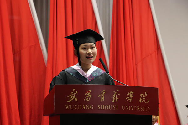 毕业生代表、金融1407班顾冰钰发言。回首大学四年的学习生活,她向母校表达了深深的留恋和感激,以及对老师崇高的敬意。她说:“是首义教会我们,唯有责任与义务相辅相成,唯有读书与实践不可辜负,唯有梦想和未来需时刻奋斗。是首义让我们做好了成才的准备,让我们找到了成才的方向,让我们努力成为栋梁。”最后,她代表全体毕业生祝福学弟学妹学业有成,祝福老师们工作顺利,祝愿母校的明天越来越好!