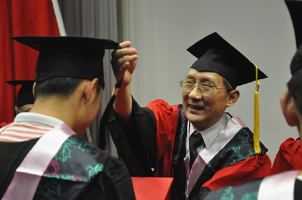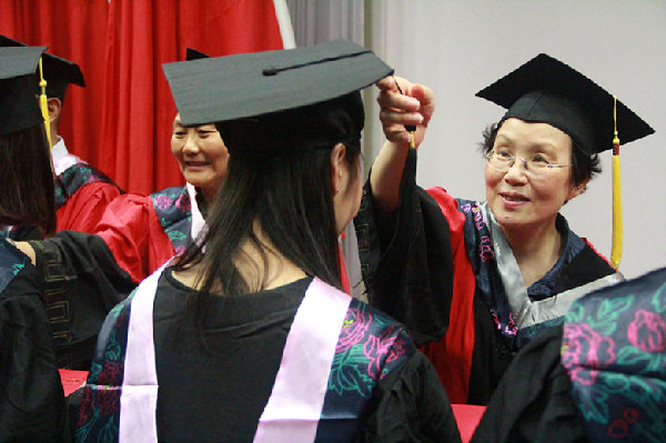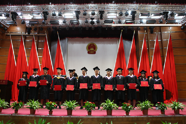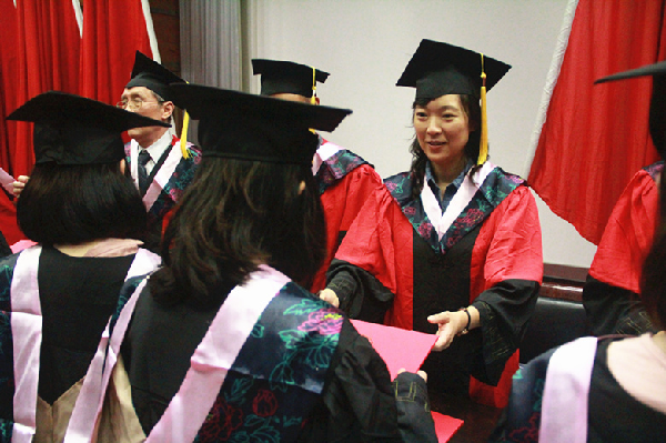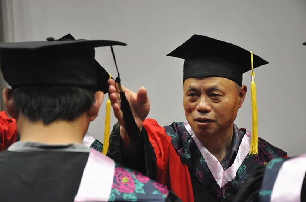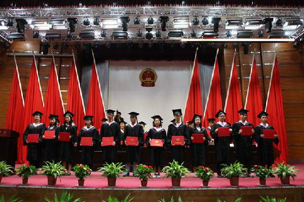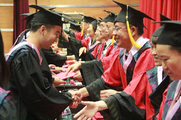 在高昂奋进的音乐中,校领导等为毕业生授学位、拨流苏,并握手祝福。仪式在《毕业歌》中圆满落幕。