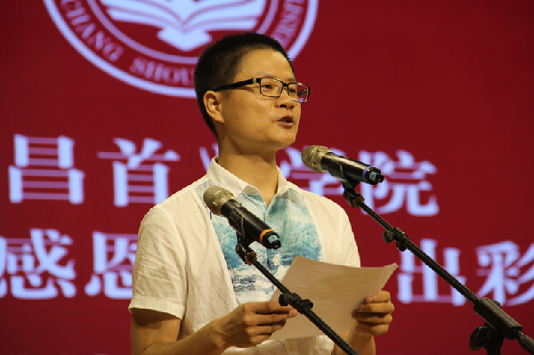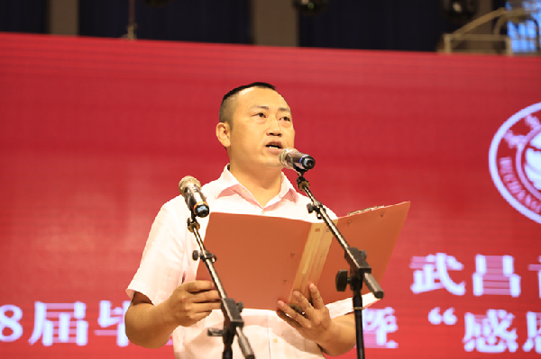 教师代表、艺术设计学院肖巍发言。他说,毕业生们不要辜负母校的培养和期待,一定要勤奋努力,追求进步,去迎接生活的各种考验。相信所有同学都会成为社会的精英、国家的栋梁!希望毕业生们一如既往关注学校发展,武昌首义学院就是你们永远的家,希望你们常回家看看!