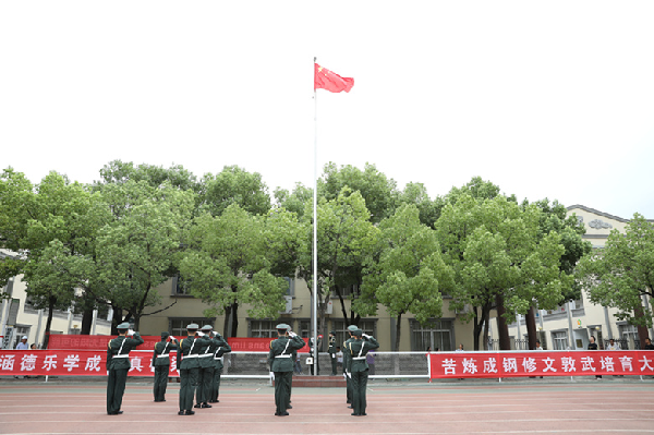 校长周进宣布军训机构组成并向军训团授旗。