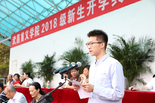 同学们,武昌首义学院的前身是华中科技大学武昌分校,学校在中国高等教育改革的大潮中已经走过了18年的发展历程,并且一直走在全国同类高校的前列。她为社会培养了一大批优秀的高素质应用型、复合型人才,良好的办学质量获得了社会的广泛认可和高度评价。2015年学校转设为普通民办高校时,更名为武昌首义学院,致力于秉承历史上武昌首义“敢为天下先”的精神,敢于改革、勇于创新,朝着建设特色鲜明的高水平应用型大学的目标奋力前行。我相信你们——2018级新生作为21世纪(也就是“00后”)的一代新人,作为学校的一员,一定会给学校的改革与发展增添新的活力。