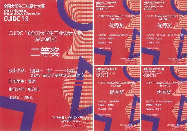 二等奖作品是廖涛同学的《别具一“革”——土家族旅游产品皮革制品设计与制作》。另外4个优秀奖作品分别是,蔡美丽同学的《黄鹤楼笔架文创设计》,张嘉敏同学的《棋乐无穷》,刘志远同学的《妙笔生圆:圆规自动铅笔设计》,裴婧格同学的《easy——弯折U盘》。