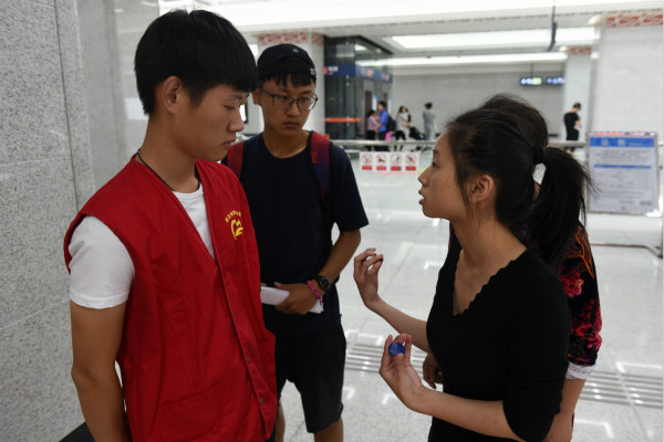 早上8点40分,志愿者们来到武昌火车站点与工作人员对接。随后,志愿者们被安排在自助购票处和部分进站口进行服务工作。上午9点,7号线正式开始运营,车站内的乘客逐渐多了起来。由于是新线路,所以乘客们对站内环境不熟悉,许多乘客都向志愿者寻求帮助。有一位80多岁的老爷爷向志愿者杜逢求助,而她听不懂武汉话,情急之下请一位路过的武汉本地人帮忙“翻译”。在热心路人与杜逢的共同努力下,老爷爷满意而去。杜逢表示,当时我只想着在最快的时间内帮老爷爷解决问题,所以向路人求助。