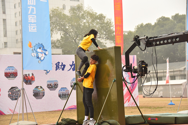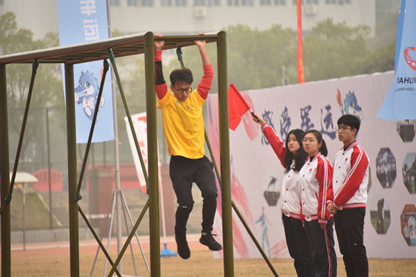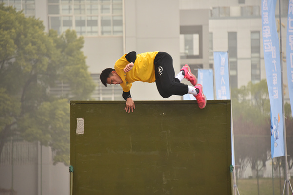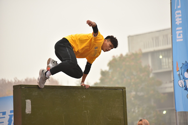 比赛形式为障碍接力,各校5名运动员一组。每名运动员须跑步通过9个障碍关卡,从第1名运动员起跑至最后1名运动员到达终点,用时最短者获胜进入决赛。男女运动员可协作完成比赛。赛场上,运动健儿们激情飞扬、奋力拼搏,主持人追踪播报比赛进程,场下观众热血澎湃,奋力呐喊,整个场面热闹非凡。我校5名运动员于A组2号出场,4名男运动员紧张刺激地完成比赛项目,当最后1名女运动员轻松跨过了前面的障碍后,由男运动员协助跨越了高板跳台和高墙,展现了体育竞技中的互帮互助精神。最终,我校代表队以3秒之差惜败于中国地质大学,止步半决赛。最终成绩4分18秒,位列小组第二。