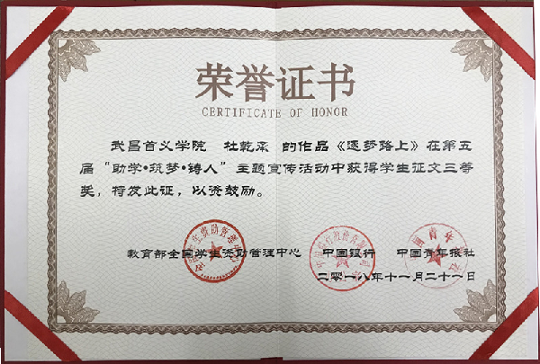 近日,从全国第五届“助学·筑梦·铸人”主题宣传活动组委会获悉,我校信息科学与工程学院电信1702班杜乾承的作品《逐梦路上》荣获学生征文三等奖。
