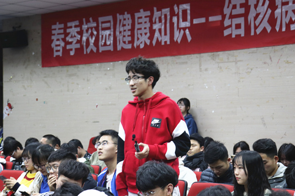 中场互动环节中,徐丹丹就“所有结核病是否都具有传染性”“发病是否与体质有关”“肺结核可以免费检查和治疗吗”“肺结核能治好吗”“结核病是不是一直具有传染性”等8个基础知识问题与学子进行交流。