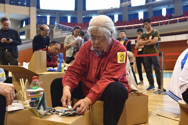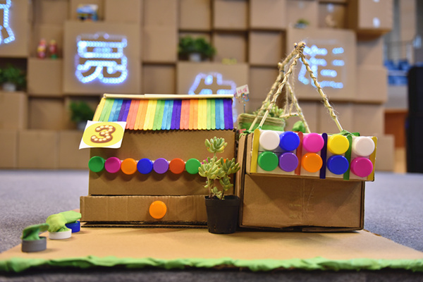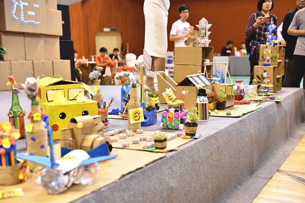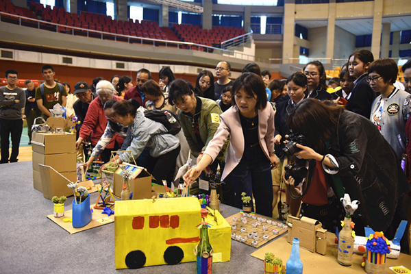现场还集中展示了由各学校师生、社区手工达人以废弃垃圾为原料制作的工艺展品和文创作品。