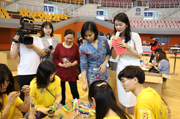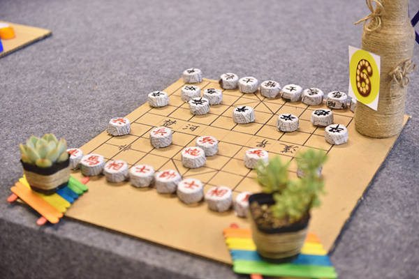 本次活动还邀请了洪山街武昌府社区代表队、梨园街东湖社区代表队、武昌首义学院代表队(2支)、中南民族大学代表队、湖北交通职业技术学院代表队、武汉供销商业学院代表队(2支)等8支“废物利用”手工达人队伍,现场进行“变废为宝”创意制作大比拼。各参赛队围绕“废有所用,创意点亮生活”的主题发挥想象力,利用各种废弃物,在45分钟内制成一件作品。比拼中,各支队伍集思广益,把生活中不经意会被当作垃圾扔掉的废物稍加创改,就变为了一件件居家小物品,既环保又实用。我校代表队利用矿泉水瓶盖制作的象棋,吸引了众多围观者的眼球。作品中还有相框夹和废瓶手绘、卡纸做的多肉盆栽等。