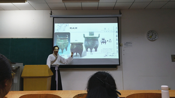 教师穿着汉服上楚文化课程,学生也穿着汉服听得津津有味,日前,在艺术与设计学院张钰副教授开设的《楚青铜器》选修课上,浓浓的古味交相辉映,极具传统文化风情。