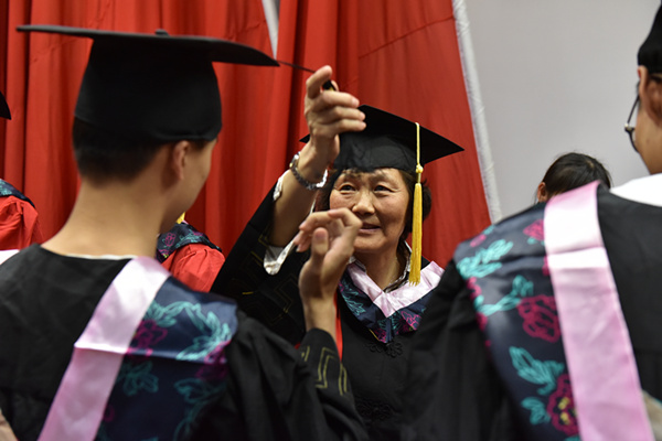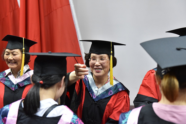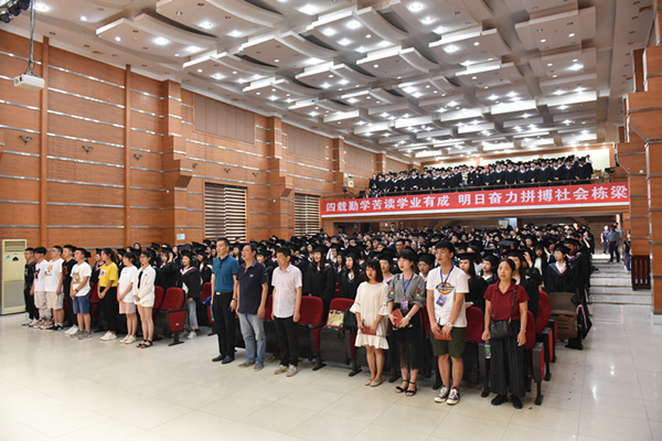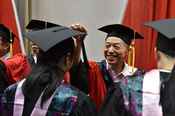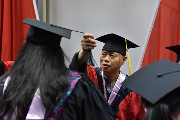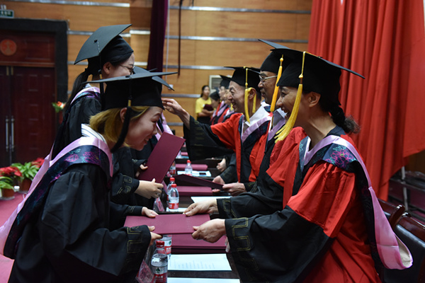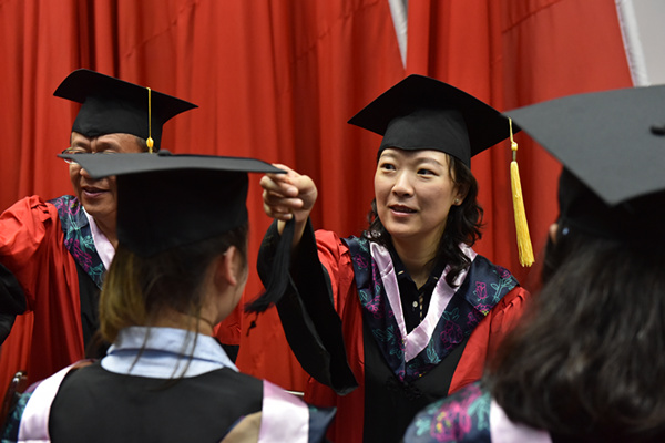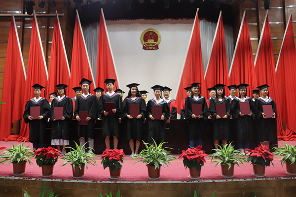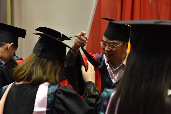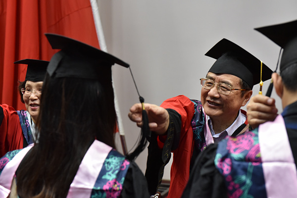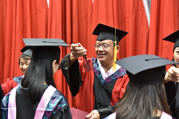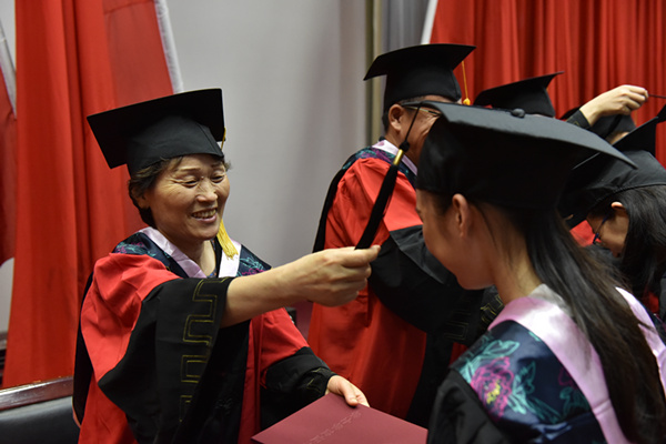 在高昂奋进的乐曲中,校领导等为毕业生授学位、拨流苏,并握手祝福。仪式在《毕业歌》的齐声合唱中圆满落幕。