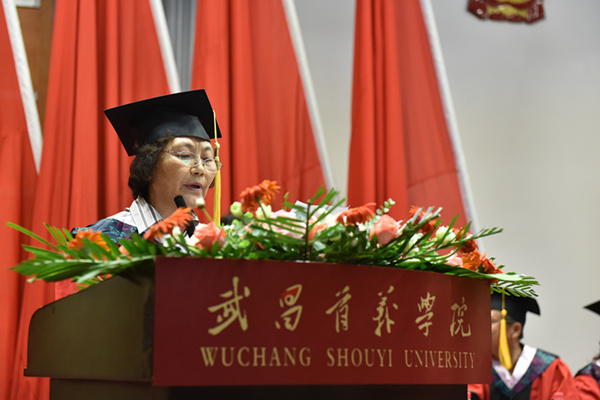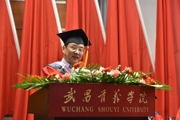 吴昌林发表讲话。他代表学校向全体获得学士学位的毕业生表示热烈祝贺和美好祝愿。他情真意切地说,你们是以武昌首义学院名义毕业的第一届本科生,今天对于你们和学校都是非常值得纪念的重要时刻。四年前,你们怀着人生梦想来到武昌首义学院,在这里度过了人生岁月中最美好、最值得怀念的时光。四年来,你们在知识、能力、素质、人格“四位一体”人才培养体系的培育下,获得思辨交流、终身学习的能力,获得一生行稳致远的重要基础,这是母校给予你们最宝贵的财富。四年的朝夕相伴,相信母校也如同你们所获得的学识一样深深地住进你们的心里,成为永恒的青春记忆。他寄语广大毕业生:志存高远,把“个人梦”的实现和“中国梦”的伟大实践结合起来,做一名新时代的奋进者和开拓者;砥砺奋斗、勇于担当,做美好生活的缔造者;不从流俗、不慕浮华,做社会良知的守望者。最后,他祝愿所有毕业生前程似锦,幸福平安,欢迎毕业生常回母校看看!