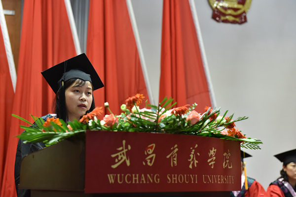 毕业生代表、英语1501班程媛发言。她表达了对于母校的感激之情,并向老师致以崇高的敬意。回首大学四年,她说:“我们经历过了大一的纯真迷茫,走过大二的轻舞飞扬,告别大三的紧张忙碌,来到了大四的收获与离别。今天,我们拿到了沉甸甸的学位证,即将奔赴新的旅程。我们能够自信的向母校宣告:我们已经把拼搏的汗水和青春的热血,献给了一生中最美好的首义时光。”最后,她代表全体毕业生,祝福学校全体师生一切顺利、万事如意,祝愿母校的明天越来越辉煌!