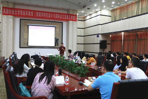 9月27—28日,由我校经济管理学院、华中科技大学管理学院、武汉理工大学管理学院共同主办,我校经济管理学院市场营销系承办的“管理学研究设计与国际论文发表工作坊”在校举行。英国杜伦大学商学院管延军教授应邀主讲。我校经管学院多位博士教师与来自同济大学、四川大学、武汉大学、华中科技大学、武汉理工大学等高校的38名青年教师、博士生和硕士生参加学习。
