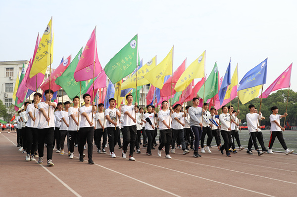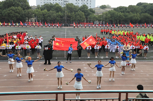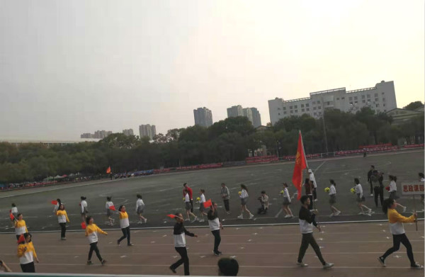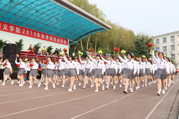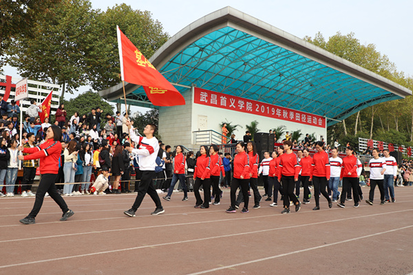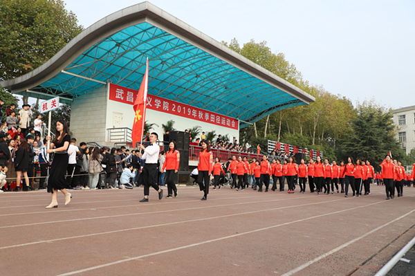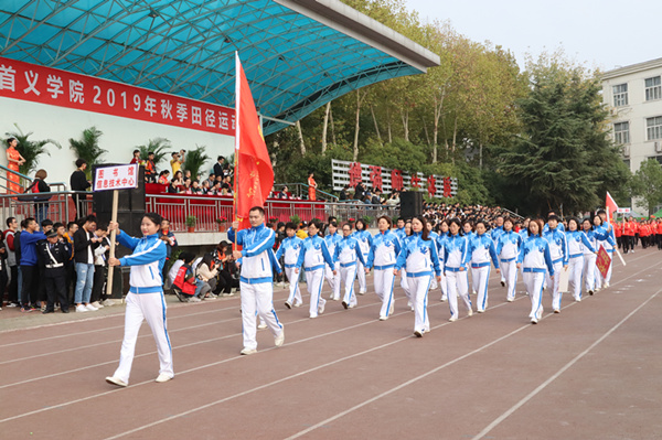 步伐整齐,携手奋进的机关代表队首先入场,他们昂首阔步,展现出良好的精神风貌。基础科学部代表队紧随其后,他们高歌猛进,将严谨求实的态度带到赛场。思想政治理论课部代表队自信入场,响亮的口号与坚定的步伐相映生辉。图书馆与信息技术中心代表队踏乐而来,服务师生,甘为人梯是他们的代名词。秉持求真务实的态度服务师生,后勤代表队牢记“三服务三育人”宗旨,整齐入场。青春动感的音乐响起,信息科学与工程学院代表队入场,啦啦操活力四射,队列变换,喊出“信科多才俊,首义圆梦来”的响亮口号。机电与自动化学院代表队街舞火爆,高歌青年奋斗强音,谱写新时代绚丽乐章。城市建设学院代表队蓝色海洋般入场,青春律动的啦啦操与红牌高举摆出“70”字样相结合,点燃赛场激情,献礼祖国华诞。伴着萌萌的玩偶与可爱的《兔子舞》,身着红色棒球服的外国语学院代表队走来,他们以魅力无限的组合展现青春活力。经济管理学院健步入场,他们摆出“NO.1”造型,满满自信彰显学院风采。随后入场的是新闻与法学学院代表队,主席台下,他们蒲扇轻摇,一段古典扇子舞燃爆全场。伴着以手绘水彩形式展现新中国成立70周年来伟大成就的十米长卷徐徐铺展,艺术设计学院代表队最后入场,他们古扇纱裙,舞姿蹁跹,传递着浓郁的中华文化。