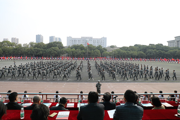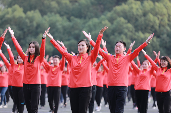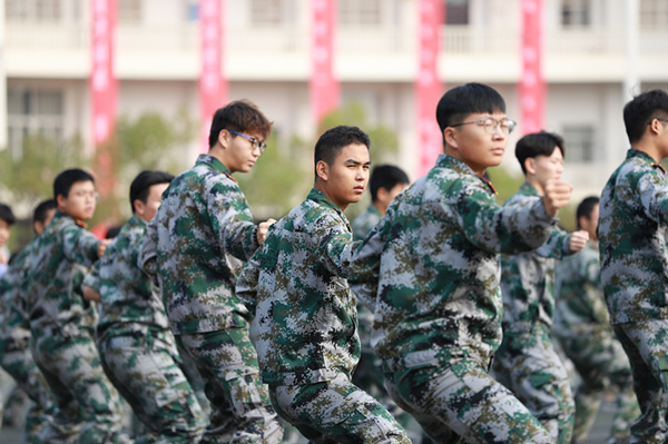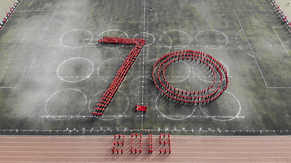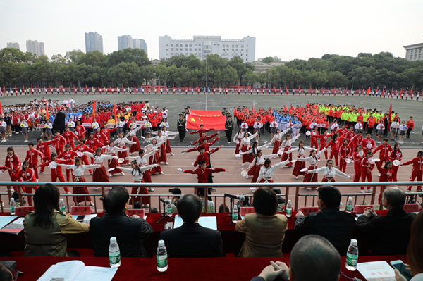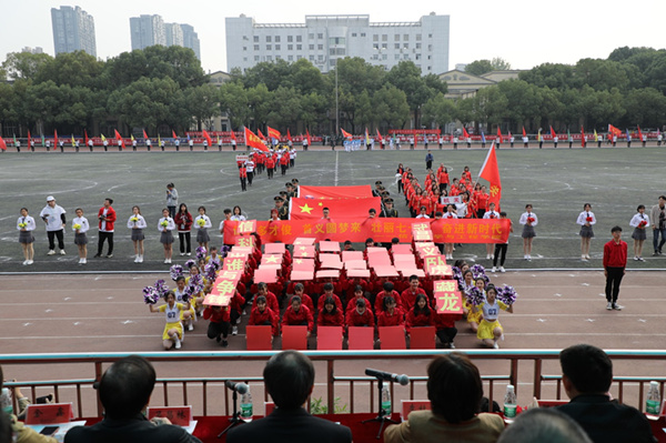 大型团体操表演正式开始。机电院400名男生身着迷彩,由操场两侧冲锋而来,他们精彩的格斗术表演铿锵有力,虎虎生威,尽展铁汉风采和阳刚之气。经管院女生们带来的舞蹈《请不要叫我女孩》青春昂扬,英姿勃发,充分展现女大学生奋发向上的姿态。由党委副书记邹星庐,党委副书记、副校长金鑫带领全校400名教职工表演的《首义齐舞,共筑中国梦》激情绽放,场面恢弘,寓意颇丰。他们摆出了人浪、同心圆、2019、70等多个造型,向祖国七十华诞献礼,赢得观众阵阵掌声。