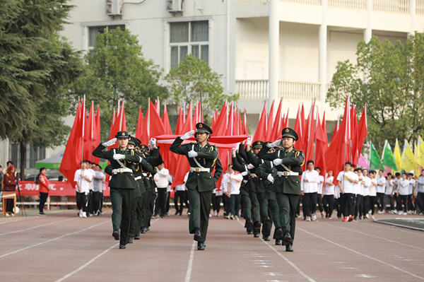 伴着慷慨激昂的乐曲,气宇轩昂、英姿焕发的国旗护卫队队员们护卫着鲜艳而庄严的国旗与校旗率先出场。红旗方队、彩旗方队和鲜花方队紧随其后,依次入场。