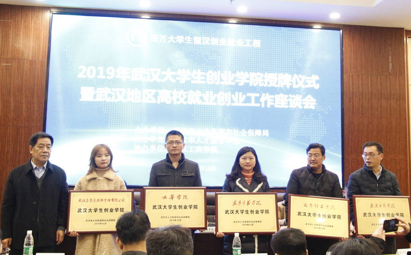 12月13日,2019年武汉大学生创业学院授牌仪式暨武汉地区高校就业创业工作座谈会在武汉工商学院举办,来自武汉地区高校、创业服务机构的近50位代表参加活动。武汉市人力资源和社会保障局副局长徐冬先为10所“武汉大学生创业学院”授牌,我校获授牌匾。