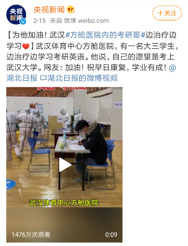 “我在学考研英语,要考新闻传播,想考武汉大学。”2月15日,《湖北日报》记者在武汉体育中心方舱医院内拍下了励志一幕,一名大三学生边治疗边学习,为了考研梦想奋斗不息。该新闻报道后,点击量很快超过千万,众多网友为这位考研哥点赞加油。《人民网》、《央视新闻》微博等主流权威媒体均转载报道。而这名男生正是我校经济管理学院学生小金。