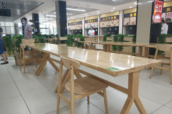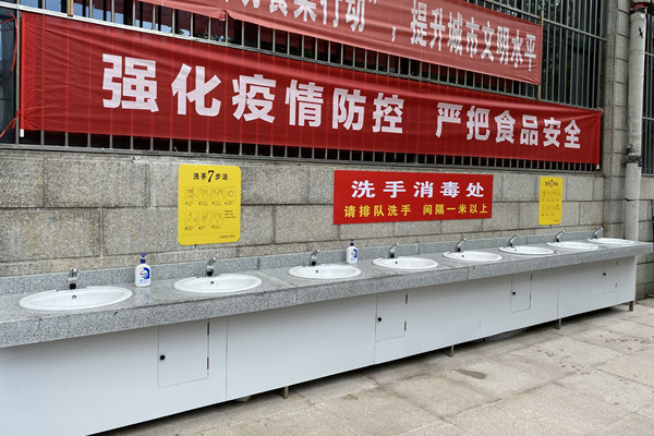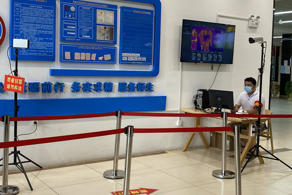 在西区学生公寓9栋门口,宿管员对进入宿舍“学生”的详细信息进行登记,查验体温显示正常后,“学生”方可回到自己的寝室。西区食堂门口,设置了自动感应洗手区、鞋底清洁区和电子测温区,“学生”进入食堂时经过专人值守的电子测温区,体温正常可顺利进入食堂就餐,异常即有报警显示,“学生”不能进入。食堂内每个就餐座位之间保持一米以上距离,为“学生”提供安全就餐环境。