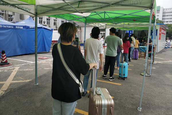 入校检测通道前,毕业生们拖着行李箱、保持1米以上间隔距离,排队等候入校,保卫处工作人员依次为毕业生携带的行李喷洒酒精消毒。进入检测通道后,毕业生出示核酸检测证明,保卫处工作人员为其测量体温、核验校园通勤码后,他们有序进入校园。经过假期建设整修,校园内移步有新绿,景色更怡人。精心布置的欢迎、祝福毕业生的标语和大型展架,营造出温馨的氛围。