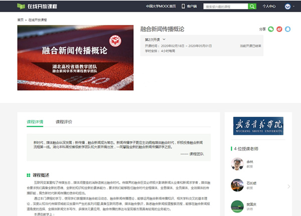 现阶段,学校线上课程建设正在稳步推进中。新闻与文法学院余林副教授课程组的《融合新闻传播概论》课程于2019年12月底上线中国大学MOOC平台,短短半年时间,校外选课累计人数已达到1962人,学生学习课件人次达2万,获得参与学习学生的一致好评。信息科学与工程学院金兰副教授课程组的《案例驱动式Python基础与应用》、艺术设计学院张钰副教授课程组的《浅谈楚艺术之美——青铜器篇》已上线超星泛雅平台,近日被平台推荐至湖北高校课程共享联盟平台,并登上该平台课程热门位置。机电与自动化学院、城市建设学院各有一门课程在紧锣密鼓筹备之中,计划于今年7月底正式上线相关线上教学平台。