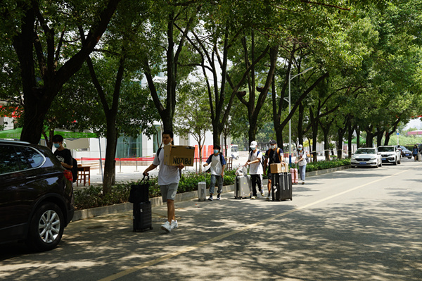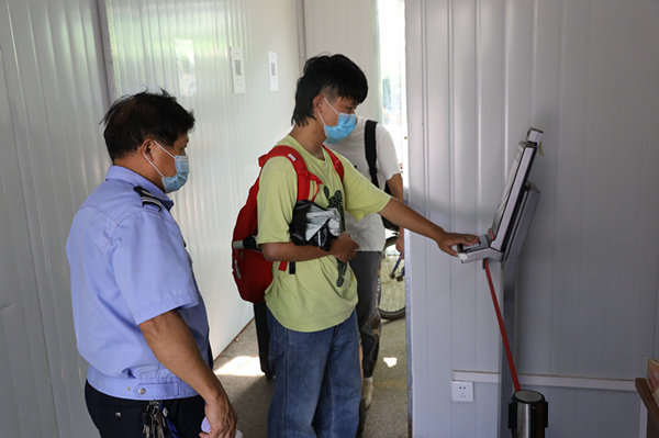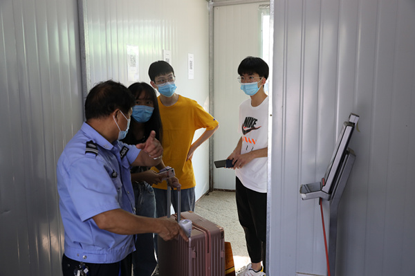 28日上午,学校门口,保卫队员和机关职能部门的老师们早早做好准备,迎接学生回家。当学生们拖着行李箱陆续到来时,他们向学生及家长介绍学校疫情防控措施和要求,引导学生和入校车辆有序通行。入校通道的门禁系统中,学生依次核验校园通勤码并测量体温后进入校园。