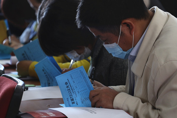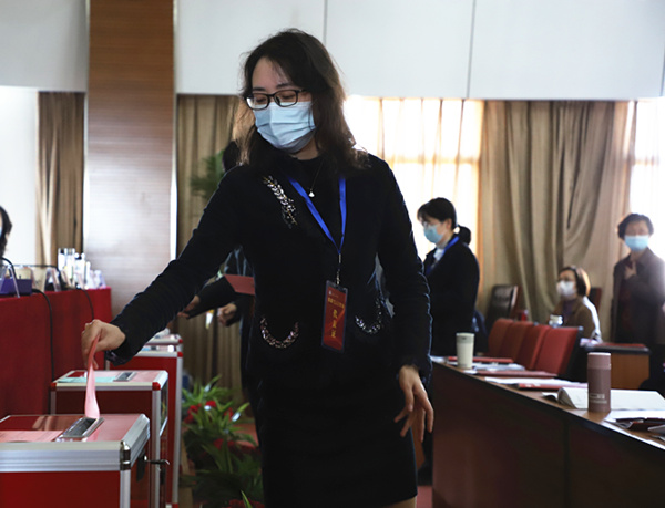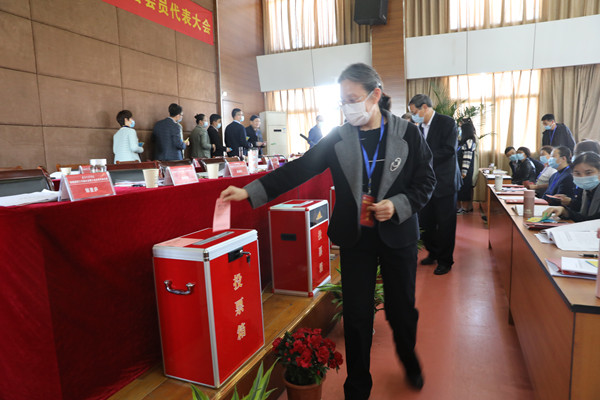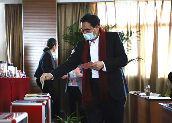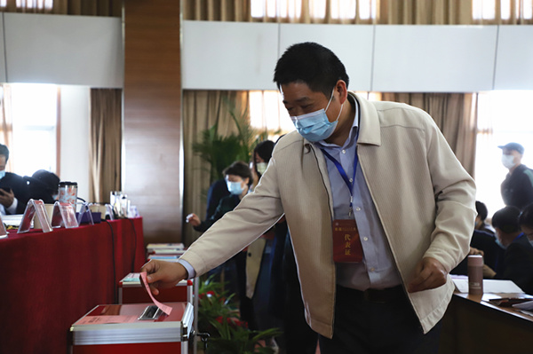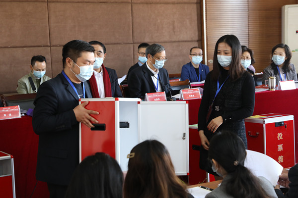 总监票人、监票人现场检验票箱,工作人员为代表们发放选票。代表们郑重填写选票,依次在投票箱投下神圣一票。
