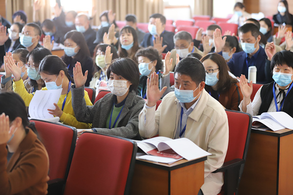 党委书记周进讲话。她指出,在学校深入学习贯彻习近平新时代中国特色社会主义思想和党的十九大精神,认真学习贯彻党的十九届五中全会精神和全国教育大会精神,努力推进高水平应用型大学建设的关键时期,召开这次重要会议对总结过去、展望未来、凝聚共识、强化担当、推动发展意义重大,标志着学校依法治校迈上了新台阶。各级工会、教代会要发挥组织优势,认真宣传贯彻本次会议精神和学校发展目标,凝聚人心,鼓舞斗志,主动团结和引导教职员工为完成学校中心工作和办学目标努力奋斗。全体代表要密切联系师生,深入开展调查研究,倾听和反映广大教职员工的愿望,充分发挥作用,引导广大师生牢固树立与学校同呼吸、共命运的意识,关心爱护建设好学校。各位代表要积极参与学校民主管理和民主监督,努力成为各项政策措施的积极响应者、有力推动者、坚定执行者,要珍惜光荣使命,主动承担重托,认真履行职责,多渠道汇集教师意见建议,为学校决策提供咨询参考,为学校事业发展添砖加瓦。校工会在代表大会闭会期间,要依据制度认真履行职责,做好提案办理工作。她号召广大教职工以习近平新时代中国特色社会主义思想为指导,认真学习贯彻党的十九大和党的十九届五中全会精神,始终坚持社会主义办学方向,坚持为党育人、为国育才,落实立德树人根本任务,深入推进三全育人,为推进学校高质量发展做出新贡献。