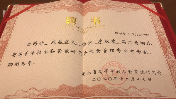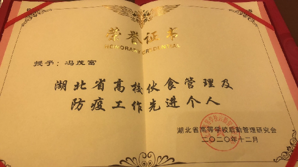 12月16至18日,2020年湖北省高校后勤研究会伙食专业部年会在湖北省襄阳市召开,省教育厅学校后勤办公室、省高等学校后勤管理研究会相关领导及省内各高校代表近200人参加会议。经过自主申报,湖北省高校后勤研究会伙专部评选审定,我校饮食中心荣获“湖北省高校伙食管理及防疫工作先进集体”称号,冯茂富同志荣获“湖北省高校伙食管理及防疫工作先进个人”称号,李跃建同志受聘为“湖北省高校后勤研究会伙食专业部专家”。