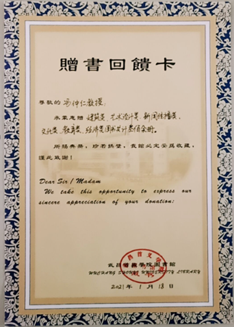 图书馆资源建设部李春媚主任表示,冯院长的捐赠是对我校图书馆馆藏资源的有力丰富与扩充,同时也让更多的读者有机会接触和利用这些宝贵的文献资源。图书馆将尽快完成这批捐赠图书的编目入库工作,及时整理上架,向读者提供借阅服务,以此不断加强馆藏资源的交流和共享,更好地发挥其学术价值。