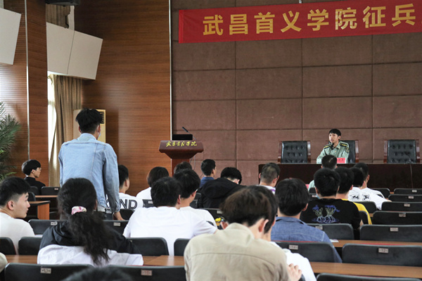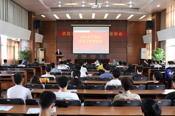 学子从军志,浓浓报国情。为加强征兵政策宣传,做好2021年下半年大学生应征入伍工作,5月26日下午,武昌首义学院征兵工作宣讲会在行政楼8楼学术报告厅举行。武汉市江汉区人民武装部部长程自武、武装部政工科科长姚琪,武汉市征兵政策宣讲员朱扬帆,校党委副书记邹星庐,学工部部长李雪出席会议。各学院学生代表70余人参加。