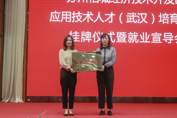 金鑫代表学校对各位领导和嘉宾表示热烈欢迎和衷心感谢。她表示,苏州相城经济技术开发区技术人才(武汉)培育基地正式挂牌,将进一步推进我校与苏州企业之间的深度产教融合,进一步拓宽我校优秀毕业生就业渠道,不断提升就业质量。随后,金鑫代表学校接受了牌匾。