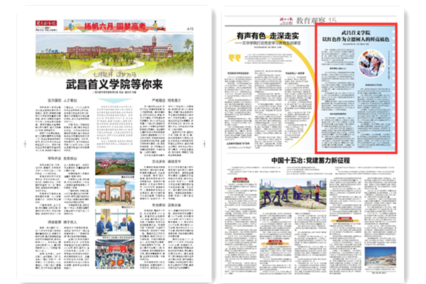 2021年新高考揭榜日,《湖北日报》《楚天都市报》均以大篇幅报道我校办学实绩。其中,《湖北日报》刊登《武昌首义学院以红色作为立德树人的鲜亮底色》文章,《楚天都市报》刊登《七月花开 以梦为马 武昌首义学院等你来》文章。