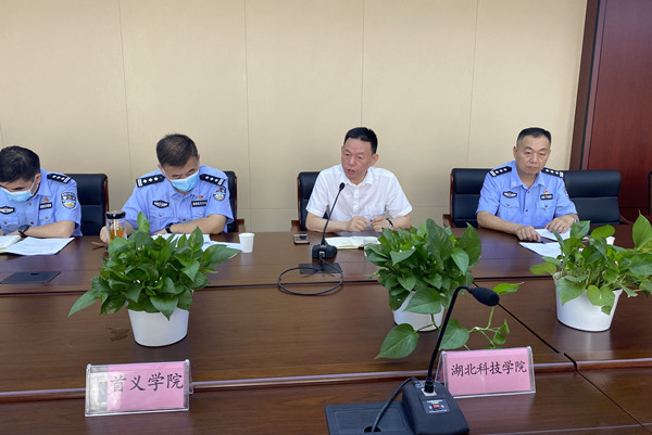 湖北商贸学院、湖北科技学院、咸宁职业技术学院、湖北健康职业学院、我校等五所在咸高校保卫部门负责人依次汇报学生报到人数和返校时间,校园安全、疫情防控等工作及校区警务室筹备情况。