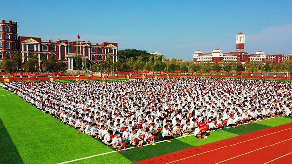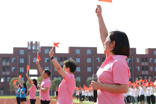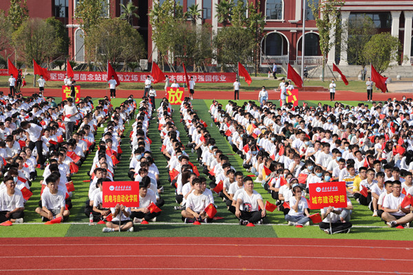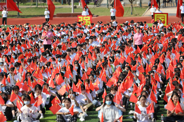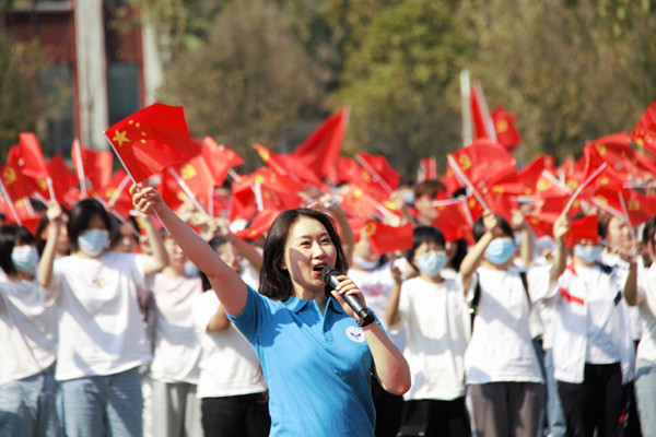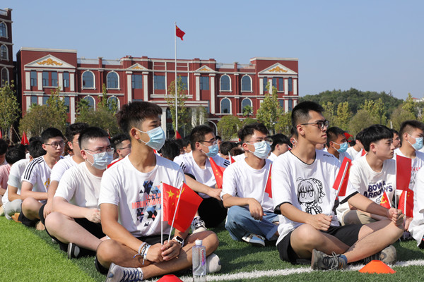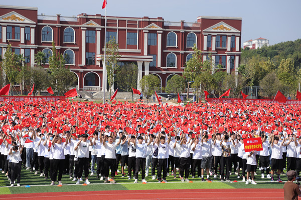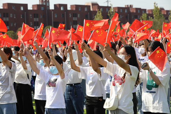 师生大合唱《我和我的祖国》将现场气氛推向高潮。只见体育场四周红旗猎猎,老师、同学们手持党旗、国旗,伴着美妙动听的歌声深情挥舞着,仿佛一片波动着的红色海洋。“我和我的祖国,一刻也不能分割……”嘹亮动人的歌声响彻校园,唱出的是师生们对祖国深沉的爱和赤子之心。合唱完毕,同学们齐声高喊:“请党放心,强国有我!”铮铮誓言在嘉鱼校区上空久久回荡。这既是学子们发自心底的庄严承诺,也是未来担当使命谱写荣光的铿锵号角。