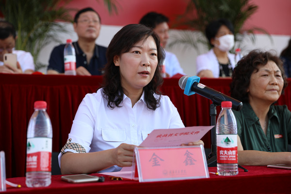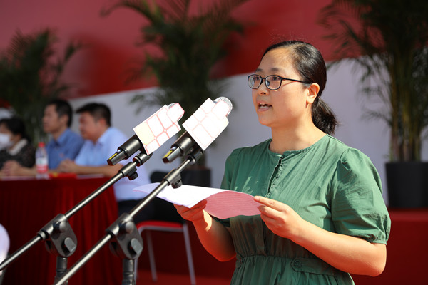教师代表、外国语学院刘娟老师发言。她说,大学四年是同学们潜下心去打基础、涨知识、学本领的时机,大家应当积极进取、沉心静气、不懈奋斗。她希望同学们勇担时代重任,学有所成,不负使命。