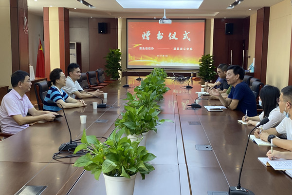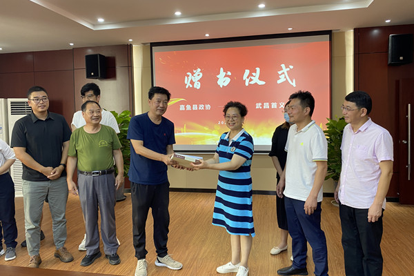 仪式上,葛婷代表嘉鱼县政协向我校赠送《嘉鱼幸会》《嘉鱼名人》《嘉鱼风物》三部图书共30册。李平代表学校接受捐赠。