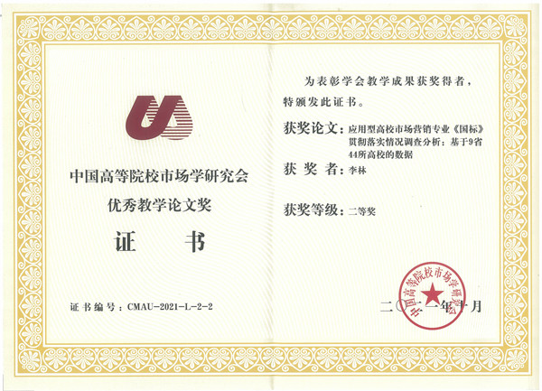 10月22日至24日,中国高等院校市场学研究会2021年教学年会暨营销学科发展论坛在北京香山饭店举行,会上公布了中国高等院校市场学研究会2021年度优秀教学论文评选结果。我校经济管理学院融合型市场营销省级教学团队带头人李林教授撰写的论文,《应用型高校市场营销专业“国标”贯彻落实情况调查分析:基于9省44所高校的数据》从参评论文中脱颖而出,喜获优秀教学论文二等奖。这是继2018年获得该研究会优秀论文三等奖之后,市场营销教学团队的教学成果再次获奖。