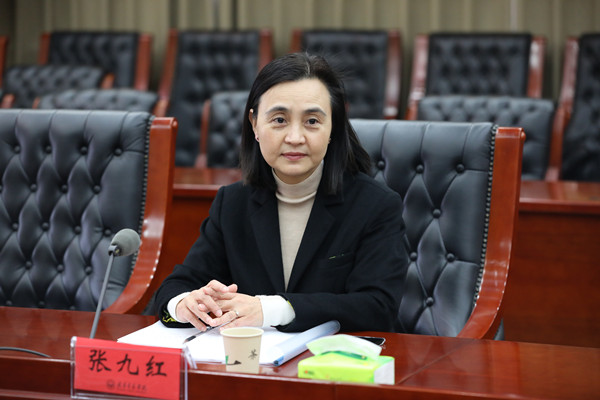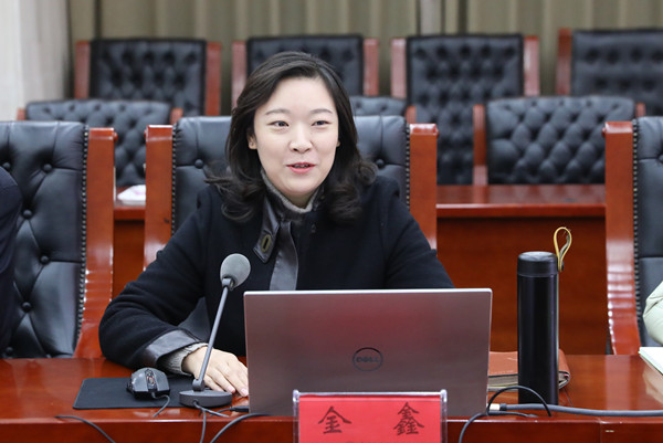金鑫就学校建设发展情况进行了汇报。她具体从学校概况与历史沿革、管理体制和校园文化、专业建设与优势专业、教育教学改革、学校三步走发展战略等五个方面展开了详细介绍。