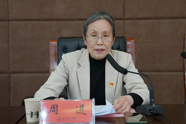 周进从筑牢信仰之基、理想信念更加坚定,增强发展信心、抢抓发展机遇的决心更加坚定,践行首义担当、为群众办实事行动更加自觉等三个方面总结了学校党史学习教育主要成效。她指出,通过党史学习教育红色思想的浸润陶冶,全校党员干部对“两个确立”的决定性意义有了更深刻理解,对中国共产党领导的独特优势有了更深刻感佩。全体师生的思想政治立场更加牢固,理想信念更加坚定,“四个意识”进一步增强,“四个自信”更加坚定,做到“两个维护”更加坚决。2021年既是建党100周年,也是学校迎接教育部本科教学工作合格评估的关键一年。通过党史学习教育,广大党员干部对“坚持真理、坚守理想、践行初心、担当使命、不怕牺牲、英勇斗争、对党忠诚、不负人民”的伟大建党精神的真谛有了更深刻领悟,广大教师为党育人、为国育才,爱岗敬业、乐于奉献,敢为人先、自强不息的意识和自觉进一步激发。广大青年学生理想信念更加坚定,为实现中华民族伟大复兴而努力学习的人生目标更加牢固。学校党委开展“我为群众办实事”实践活动,坚持把办实事、解难题作为检验党史学习教育成效的根本标尺,聚焦师生最直接、最现实的急难愁盼问题,扎实推动学习教育走深走实,师生员工学习生活条件得到了全面提升和优化,获得感、幸福感进一步增强。