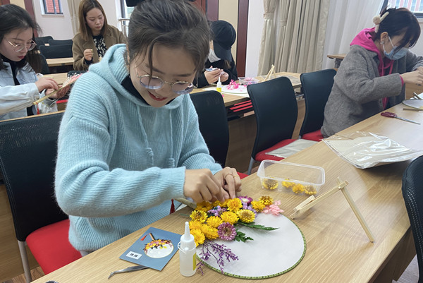 分工会主席何实向大家介绍了团扇的起源与寓意,展示了团扇的DIY手工制作过程。各位女教师带着节日的欢愉,忙里偷闲,倾心投入到活动中。她们精心构思,各式各样的材料经过巧手摆弄,再以各色鲜艳的野花镶嵌其上,一把把清丽含情的团扇便绽放着春的生机跃然眼前,令人赏心悦目。