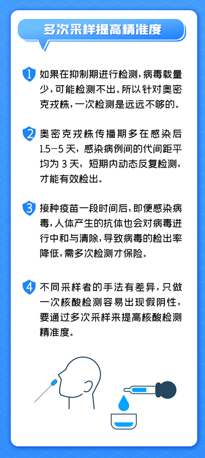此外,从采样手法来看,不同采样者的手法有差异,可能导致单次采样时没有采集到精准部位的样本,只做一次核酸检测容易出现假阴性,要通过多次采样来提高核酸检测精准度。