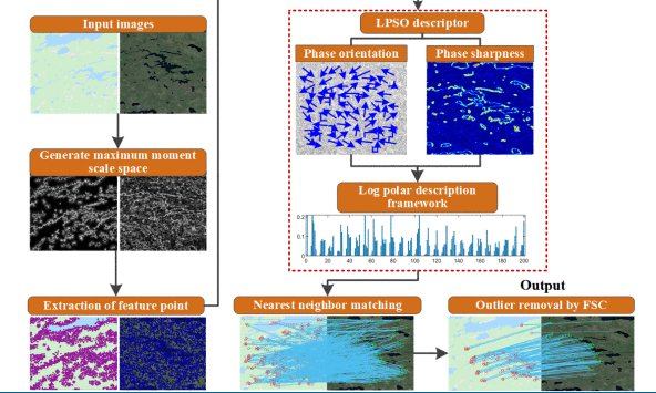 该成果提出了一种联合局部相位锐度定向特征描述的多源图像匹配方法。针对多源图像之间的强度差异大和非线性辐射畸变所导致的匹配难题,建立了一种局部相位锐度定向描述子(Descriptor of local phase sharpness orientation,LPSO)。实验结果表明:在多源图像匹配中,LPSO算法在综合匹配性能上明显优于SIFT、LGHD、RIFT等方法,其平均同名点匹配数量提升了约2~4倍,RMSE误差在2像素以下,与HAPCG算法相比,LPSO算法匹配鲁棒性更佳。