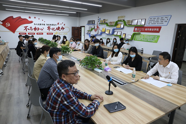5月9日下午,湖北省“百名支部书记进高校”宣讲会走进我校,中建七局有限公司南方公司华中事业部党总支副书记、总工程师陈江伟应邀在城市建设学院会议室宣讲党的十九届六中全会精神。校长助理、宣传部长王洪波,城市建设学院院长冯仲仁、党总支书记林飞与该院学生党员、入党积极分子聆听宣讲会。