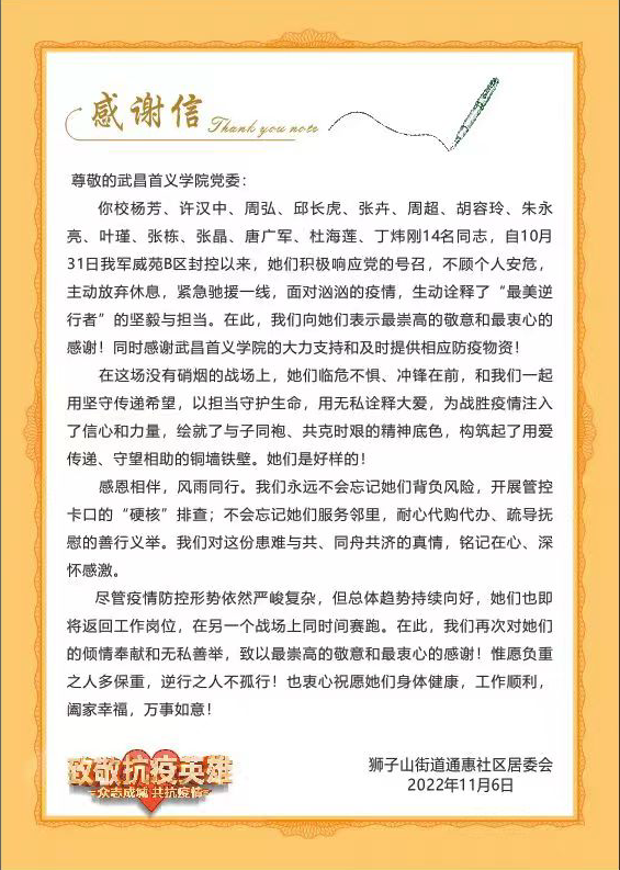 党旗高扬!我校党员下沉防疫获洪山区通惠社区来信点赞